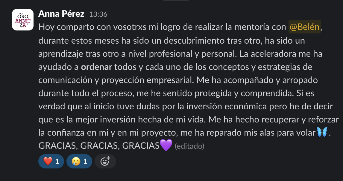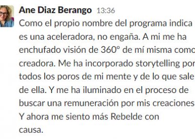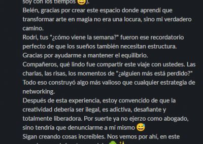 Diirijo mis propios proyectos creativos, así que solo tengo tiempo para ayudar a 3 creadores cada vez que abro un ciclo, por lo que las plazas son muy (muy) limitadas.